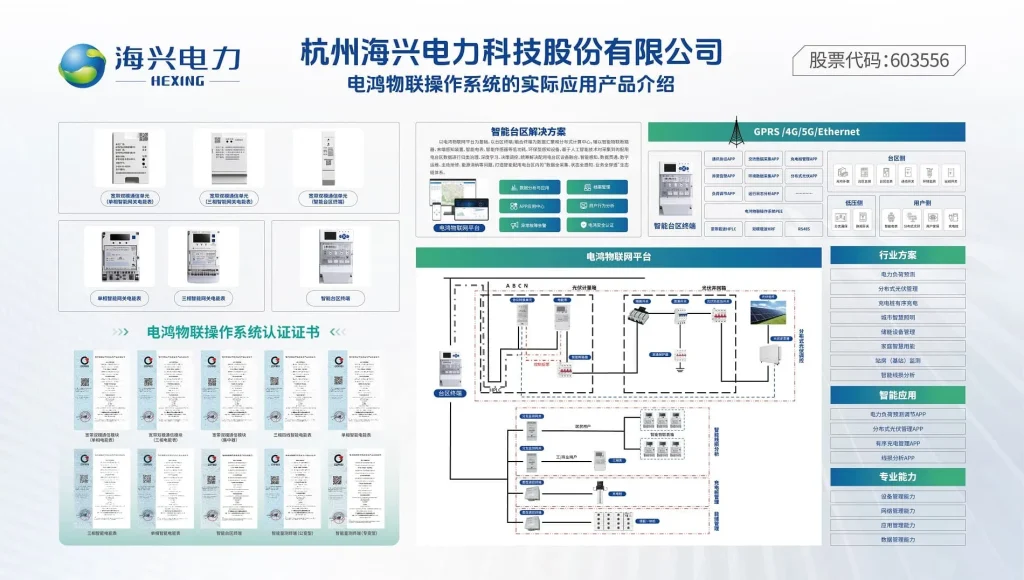 海兴电力在电鸿生态建设中取得了实质性进展。公司针对电鸿生态推出了多款核心产品,包括:智能台区终端、宽带双模通信模块、单相智能网关电能表、三相智能网关电能表。这些产品均成功获得了电鸿物联操作系统认证证书,体现了海兴电力在产品研发与技术适配方面的强大实力。