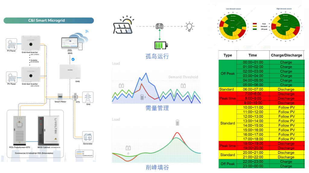 1、利用微电网系统,通过EMS 系统进行设备监控,可进行削峰填谷、能源套利、降低变压器需量等灵活配置调控。
