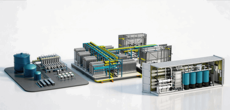 撬装式水厂采用撬块化结构设计,将核心水处理单元安装于钢结构底座上。相比集装箱形式,撬装式系统在尺寸、工艺组合和现场集成方面更具灵活性,适用于工业用水、市政配套、临建项目及已有厂房内改扩建场景,同样可结合光储系统和数字化平台运行。